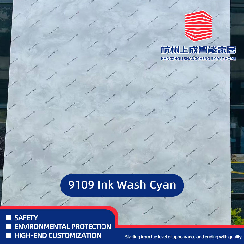 Placa decorativă model 9109 Ink Wash Cyan are un finisaj unic inspirat de cerneală cu apă, care oferă o senzație de liniște artistică oricărui interior. Suprafața, obținută prin acoperirea cu film de înaltă definiție, imită fluxul subtil al picturii tradiționale cu spălare cu cerneală, oferind în același timp durabilitate modernă. Placa este ușoară, rezistentă la umiditate și ușor de tăiat și instalat. Disponibil în dimensiuni de 1200x2400mm și grosimi de 4mm, 6mm și 9mm.